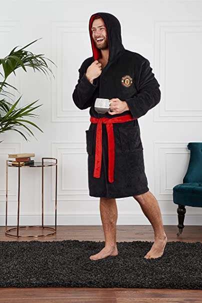 MANCHESTER UNITED MENS DRESSING GOWN — Discover our Manchester United hooded dressing gowns for men which have been specially designed to provide you with the ultimate comfort. They are made from fleece material which is super soft inside and out and feature a nice design with the Manchester FC logo on the front.