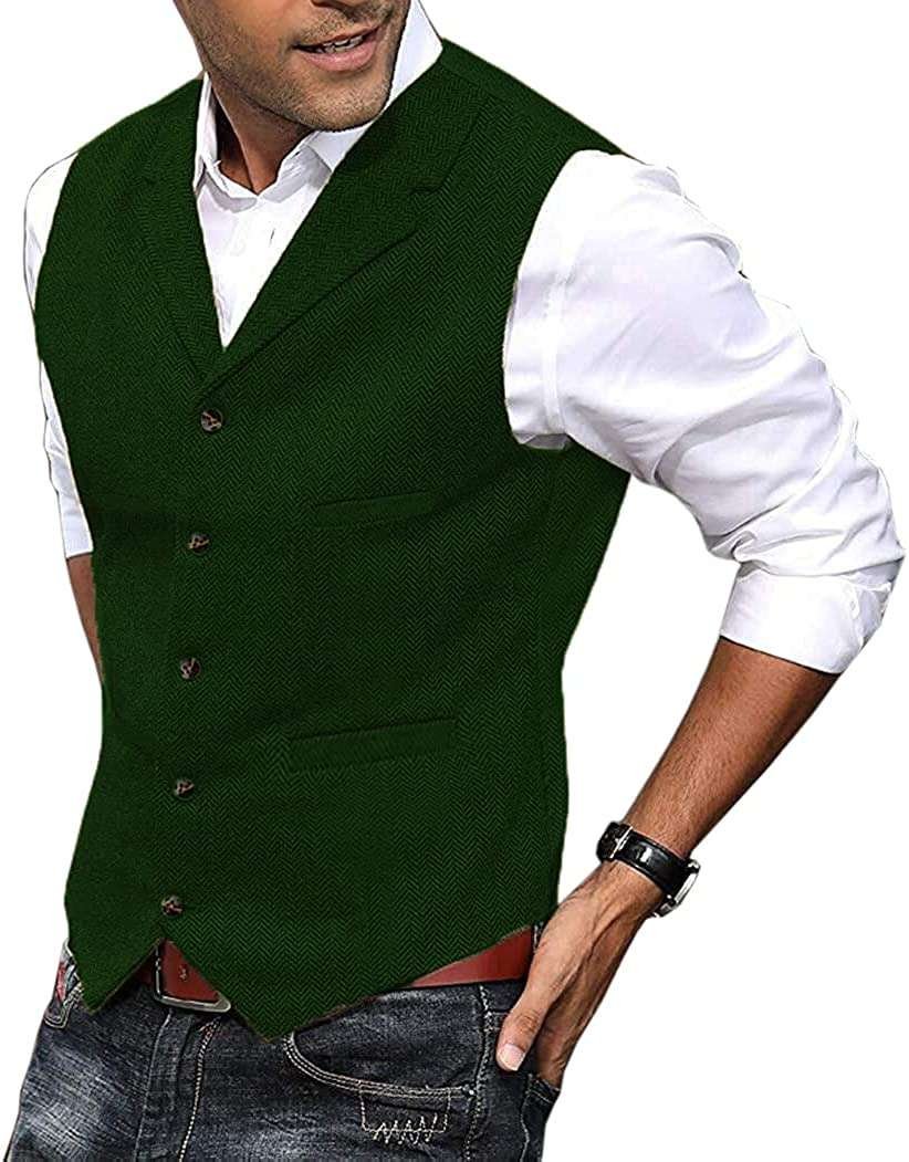 Mens Vest Casual Soft Wool Tweed Suit Vest Herringbone Waistcoat for Groosmen Best Man
