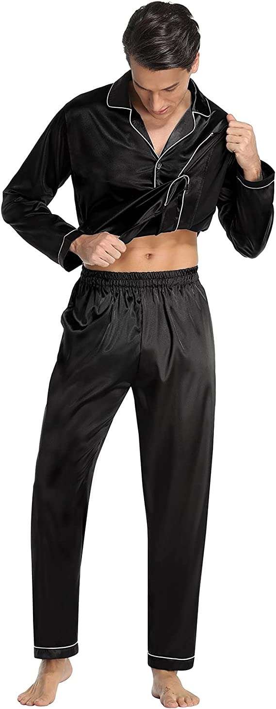 Details◆The top of the mens satin pyjama set is with one front pocket on chest to meet your storage need; Pants features elasticated waistband to make it a better fit, and it also has 2 side pockets.